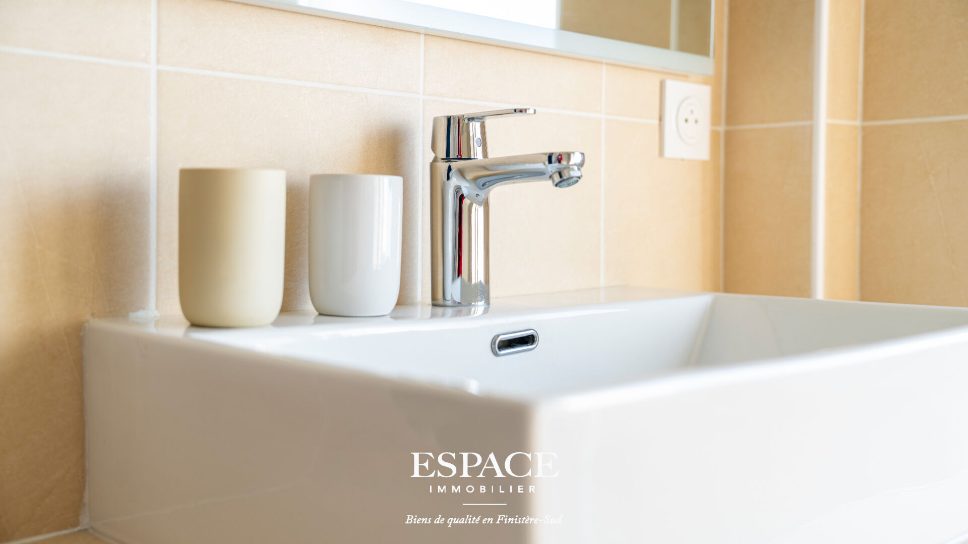 D'une surface de 97.40 m², l'entrée dessert une belle pièce de vie lumineuse, prolongée par une cuisine ouverte équipée, où la mer et la Ville Close s'invitent à chaque regard. Elle est complétée par une arrière-cuisine.