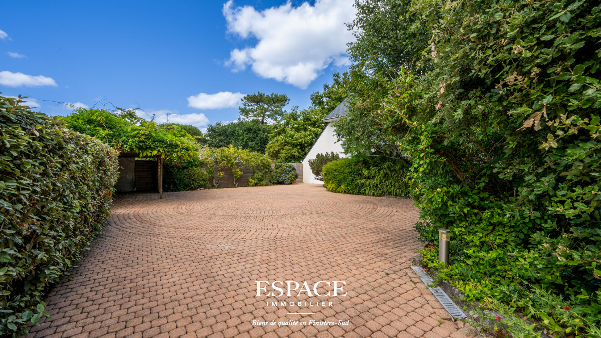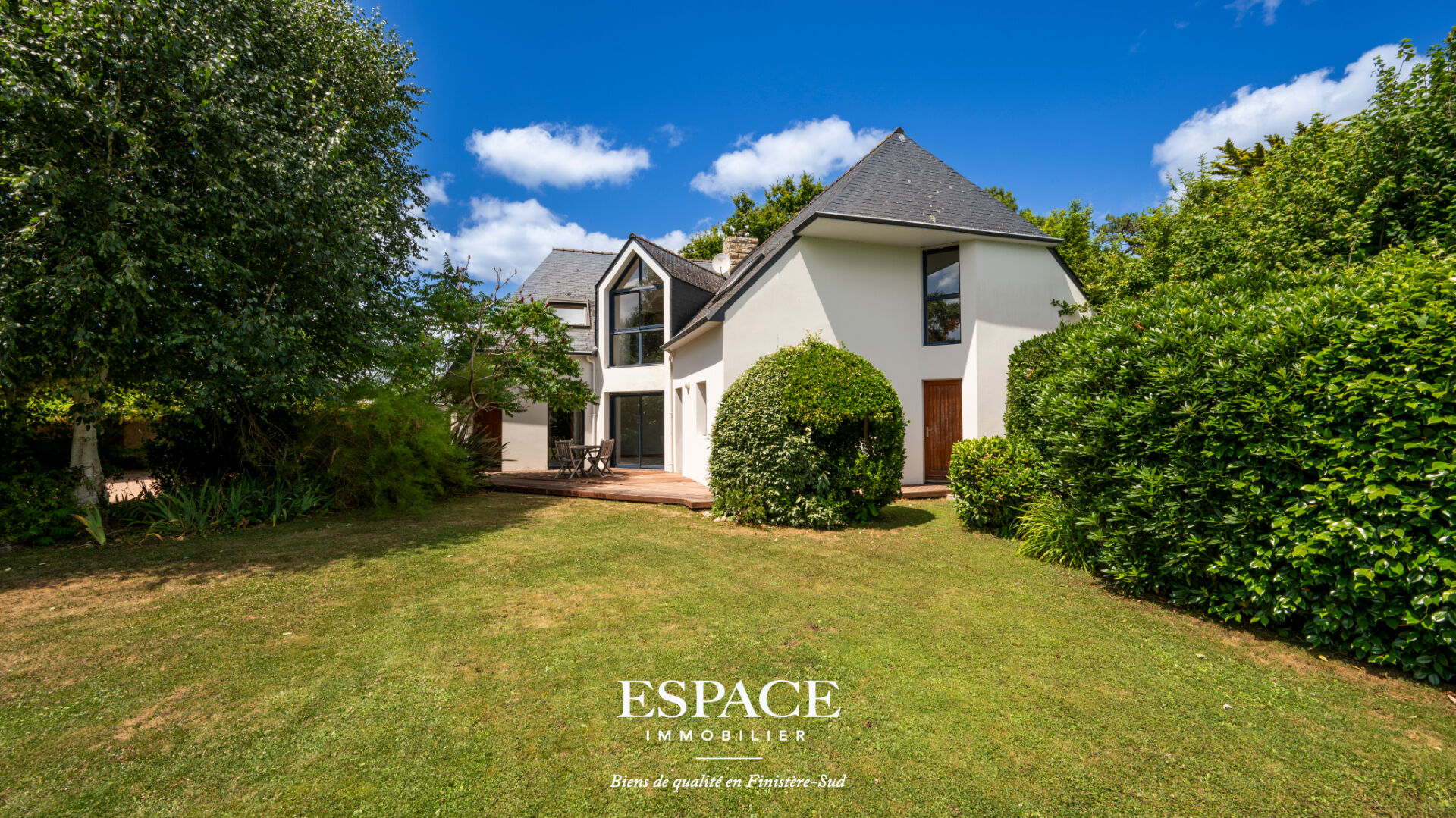 Le Cabellou, à proximité immédiate du bord de mer et des plages, cette maison d'architecte développe environ 169 m² habitables, au coeur d'un terrain clos, paysager et sans vis-à-vis de 1 500 m². Passée la belle allée pavée, l'atmosphère se fait paisible et confidentielle. Un grand parking accueille les véhicules à l'abri des regards, tandis que le jardin, soigneusement entretenu, abrite un espace piscine intimiste, véritable havre de tranquillité. La maison s'ouvre sur une entrée menant au salon-séjour agrémenté d'une cheminée et ouvert sur une terrasse. La cuisine indépendante aménagée se prolonge d'une arrière-cuisine. Une chambre, une salle de bains, des toilettes indépendantes ainsi qu'un garage intégré complètent ce niveau. A l'étage, baignée de lumière naturelle par une grande lucarne, une mezzanine dévoile un espace polyvalent, parfait pour imaginer un bureau, une bibliothèque ou un salon de lecture. Elle dessert trois chambres, dont une disposant d'une salle de douche attenante, une salle de bains, un second WC, une lingerie et un grenier offrant une capacité de rangement appréciable.