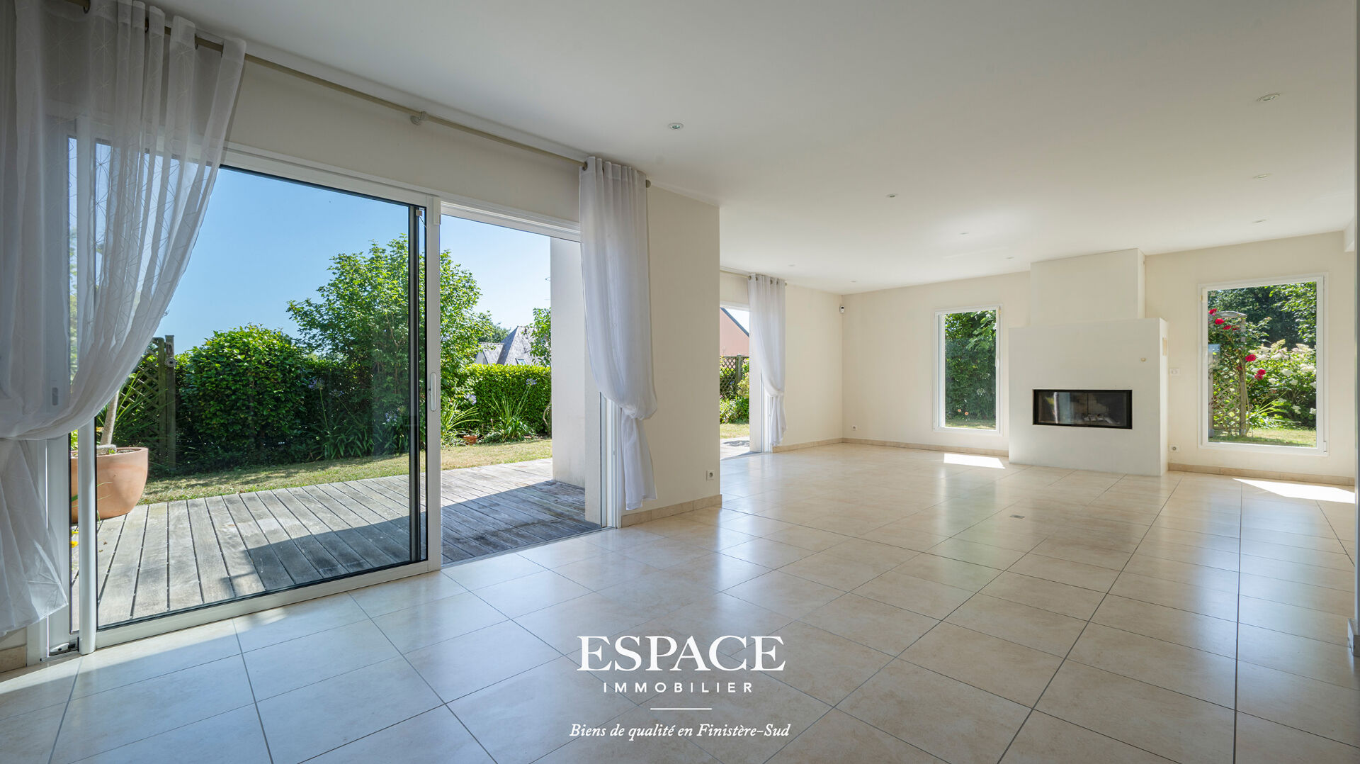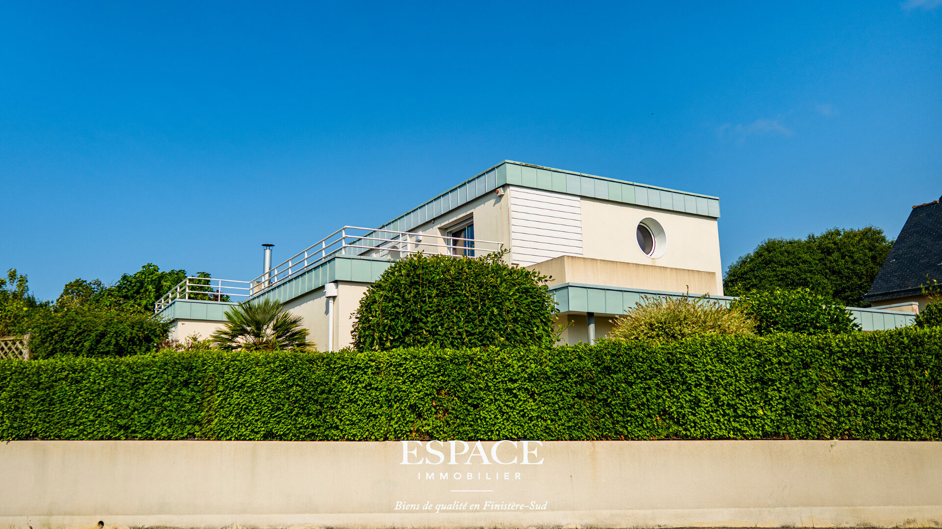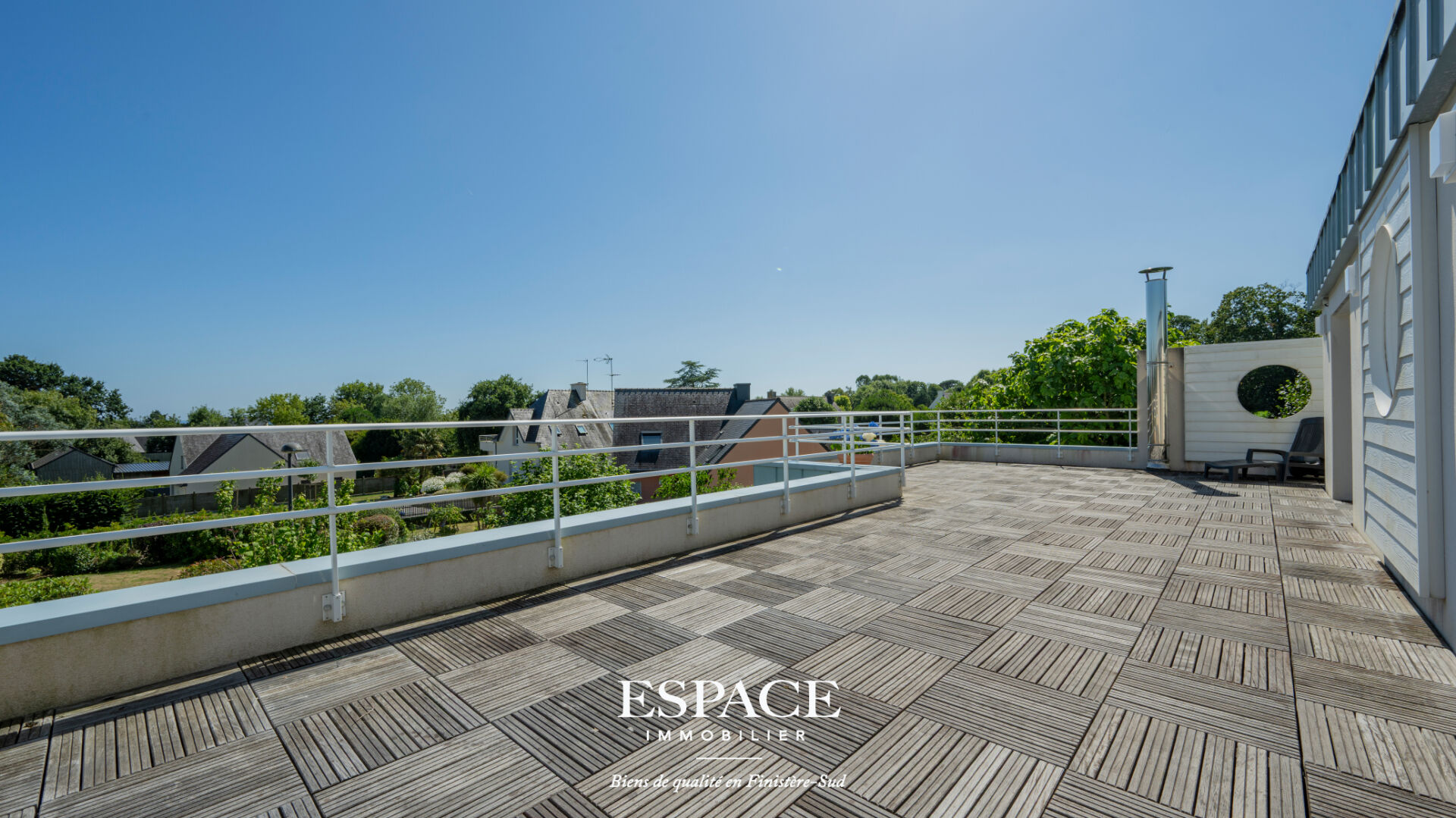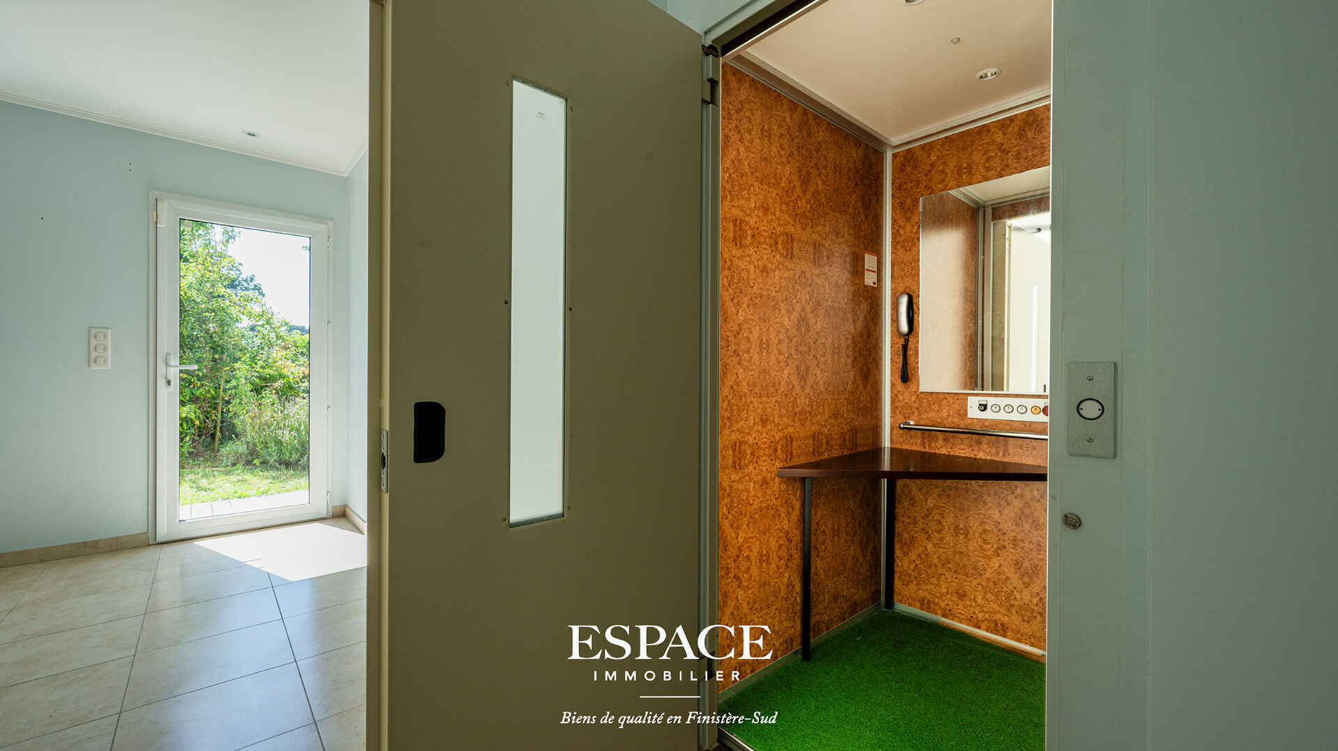 Sur la rive droite de CONCARNEAU, au calme, entre mer, ville et nature, cette maison combine architecture contemporaine, qualité de vie, situation stratégique et prestations rares. D'une surface de 162 m² habitables baignée de lumière, elle s'organise au rez-de-chaussée autour de larges baies vitrées, d'une entrée, d'un salon-séjour agrémenté d'une cheminée, d'une cuisine équipée avec une arrière-cuisine, et d'une suite avec une salle de douche idéale pour recevoir ou vivre de plain-pied. A l'étage, un dégagement distribue une grande chambre, deux chambres supplémentaires, une salle de douche et surtout une large terrasse solarium, véritable atout extérieur qui se déploie comme un véritable belvédère et offre un cadre propice à la détente ou aux moments conviviaux en hauteur. Un ascenseur intérieur, rare sur ce segment, dessert tous les niveaux, y compris la cave de 72 m² offrant un espace de stockage ou d'aménagement généreux. Le tout s'ouvre sur un terrain paysagé de 714 m², complété par un garage, un carport et une allée. Un bien singulier, pour une vie contemporaine entre lumière, confort et douceur de vivre, à découvrir avec l'agence ESPACE IMMOBILIER, spécialiste des belles maisons et des beaux appartements en Finistère Sud. Diagnostics immobiliers en cours de réalisation. Les informations sur les risques auxquels ce bien est exposé sont disponibles sur le site Géorisques : [www.georisques.gouv.fr] (http://www.georisques.gouv.fr). (3.97 % honoraires TTC à la charge de l'acquéreur.)