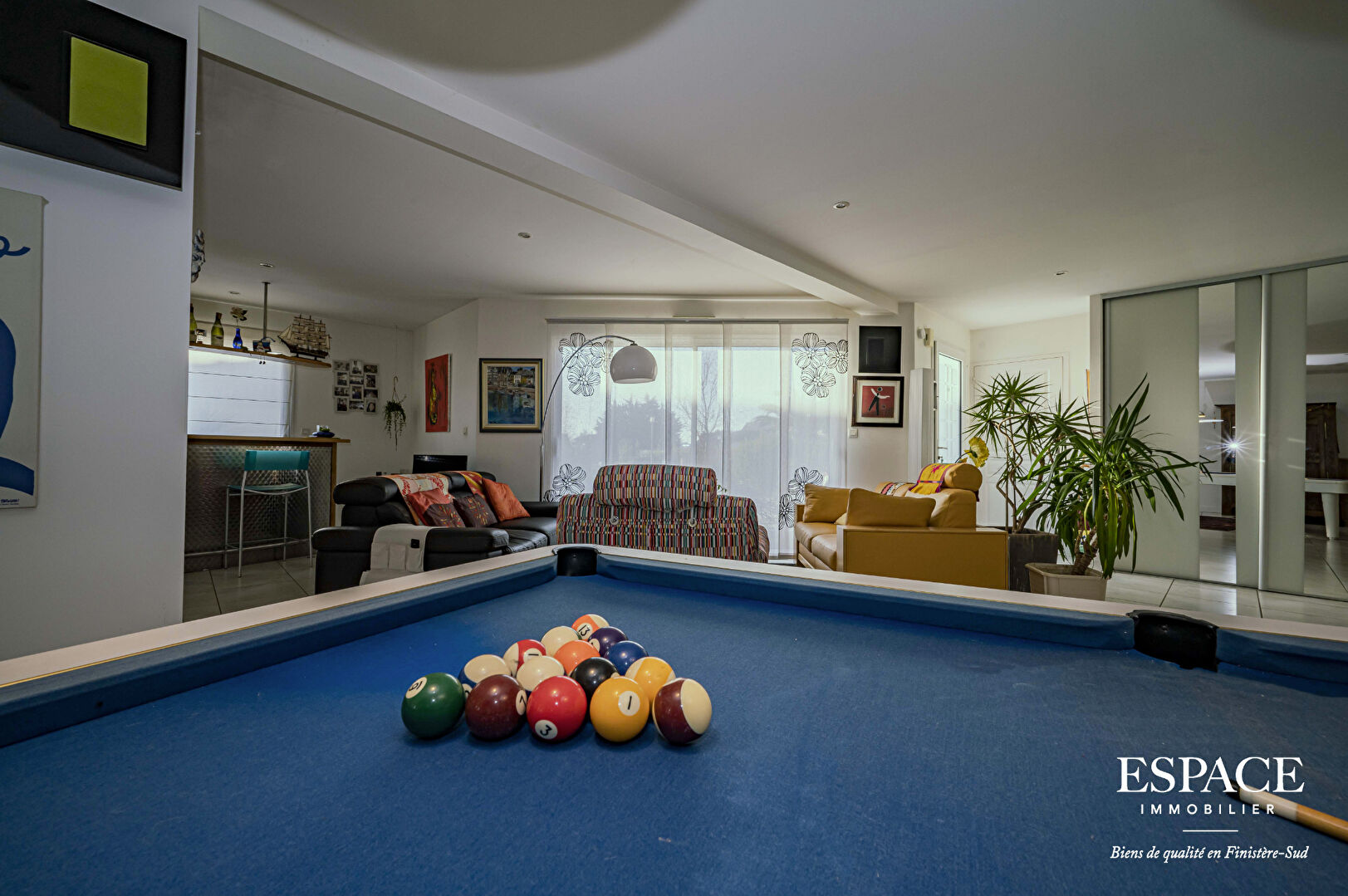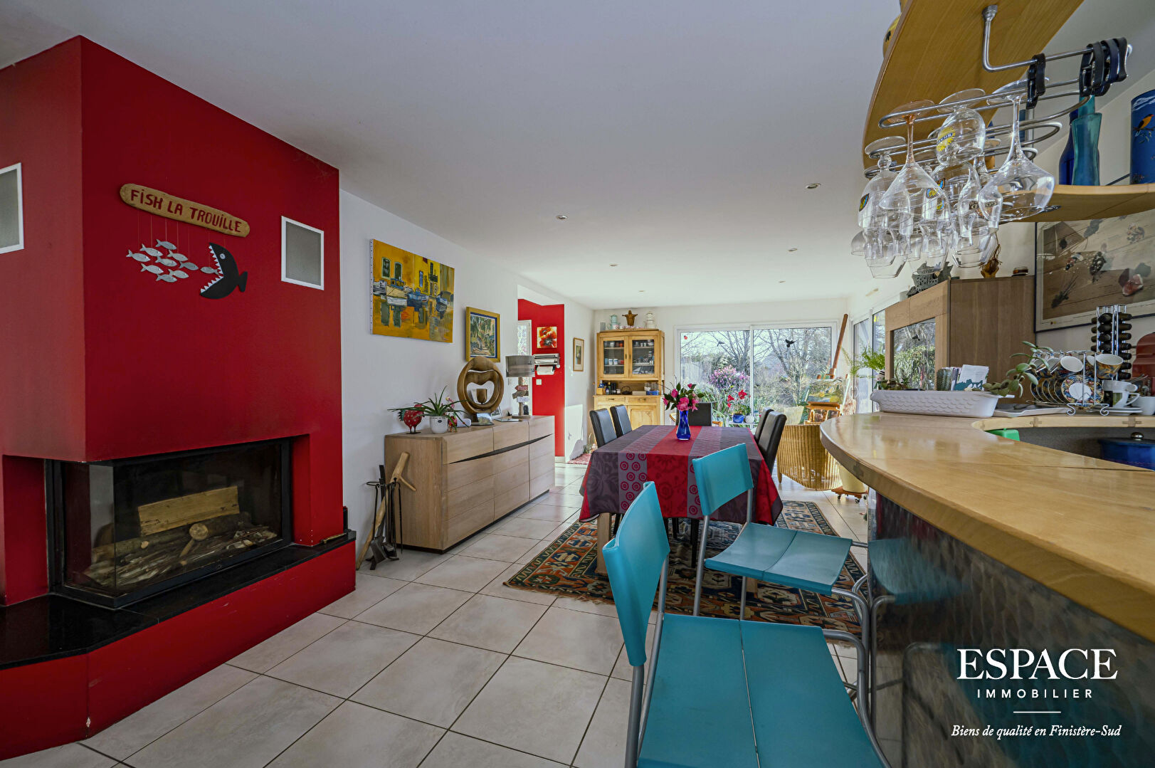 VENDU PAR L'AGENCE - Proche des plus belles plages et du sentier côtier, laissez-vous séduire par cette contemporaine intégralement de plain-pied d'une surface de 150 m² édifiée sur un terrain de 1 709 m². Elle dévoile un vaste espace de vie de 91 m² baigné de lumière et tourné vers les extérieurs comprenant une cuisine ouverte équipée, un salon, une salle à manger. L'ensemble est agrémenté d'une cheminée insert et d'un bar. Côté nuit, elle offre une suite parentale avec une salle de douche / WC et deux chambres qui se partagent une salle de bains. Cette maison aux atouts certains séduit aussi pour ses prestations complémentaires : un bureau, une belle cave à vin, un cellier, un garage, un parking et ses équipements : un chauffage au sol par géothermie, une aspiration centralisée et de nombreuses enceintes hifi. A l'extérieur, le jardin paysager, la grande terrasse et le boulodrome sont la promesse de partager de bons moments en famille et entre amis. On y trouve également un puits, un ruisseau et un abri de jardin. Ce bien est à découvrir en EXCLUSIVITE avec l'agence ESPACE IMMOBILIER - biens de qualité en Finistère Sud. Les informations sur les risques auxquels ce bien est exposé sont disponibles sur le site Géorisques : www.georisques.gouv.fr